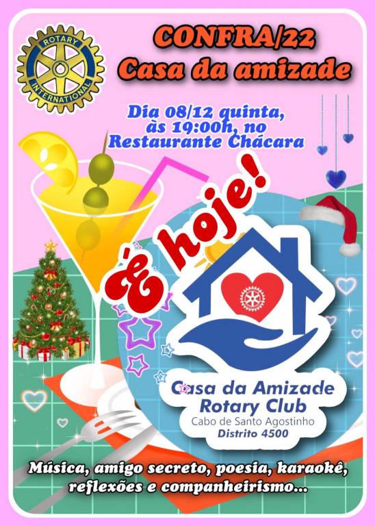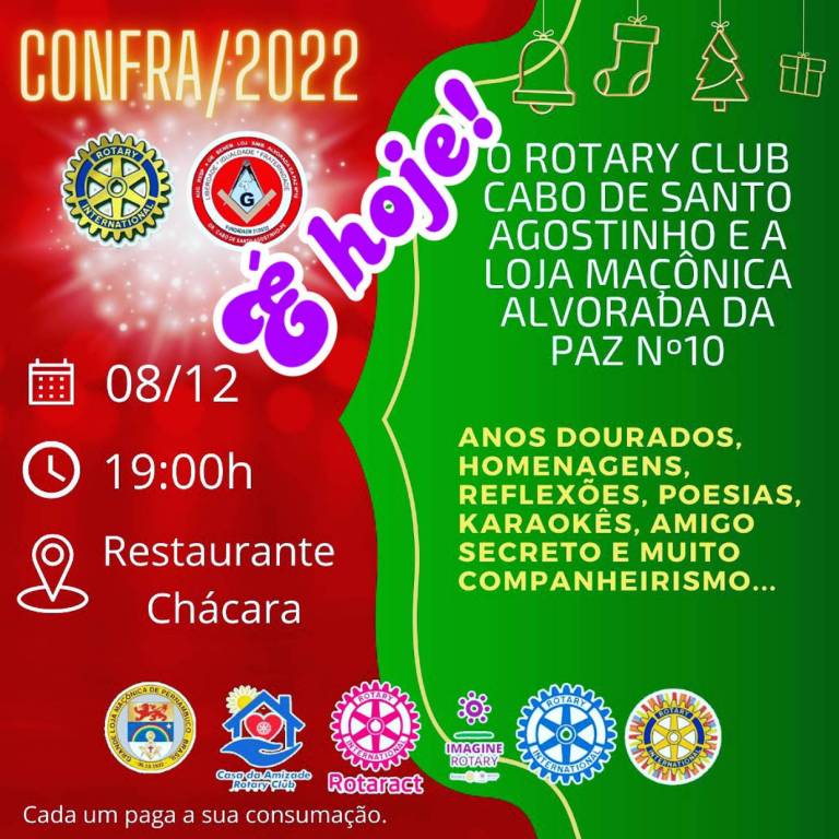 Aconteceu nesta quinta-feira no Restaurante e Pizzaria Chácara na Vila Social Contra Mocambo a confraternização dos associados do clube. O presidente João Sávio 2022/23 convidou as damas da Casa da Amizade e membros da Loja Maçônica Alvorada da Paz n° 10, durante a plenária, rotarianos foram agraciados com a Comenda do Mérito Rotário - Vicente Yañez Pinzon, como também a Loja Maçônica Alvorada da Paz n° 10, fez homenagens com a Comenda do Mérito Maçônico Joaquim Nabuco, com momentos de falas dos rotaríamos e convidados, troca de presentes na brincadeira de Amigo Secreto.