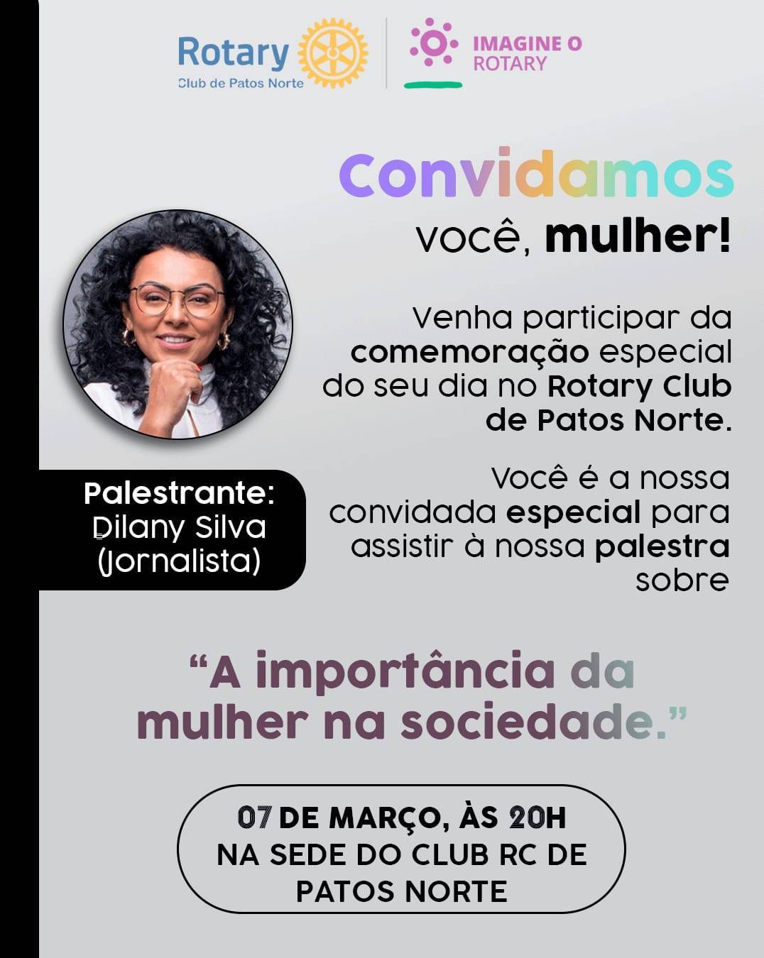O Rotary Club Patos Norte, convida você *MULHER*, para participar da programação especial em comemoração ao seu dia, que será realizada no dia 07 de março de 2023, na sede do nosso Club