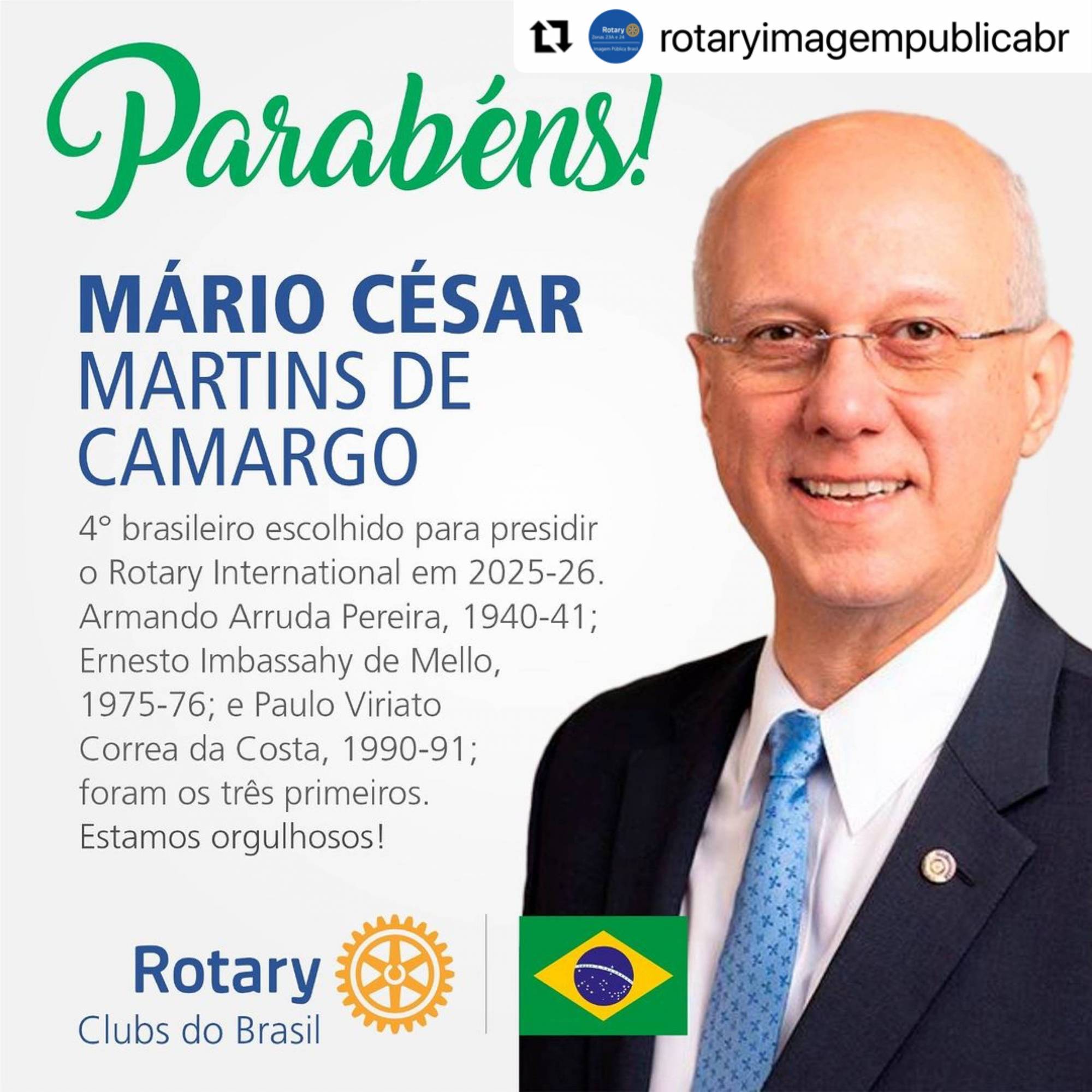 Mário César é o 4º brasileiro eleito para presidir o Rotary International. Armando Arruda Pereira, 1940-41; Ernesto Imbassahy de Mello, 1975-76; e Paulo Viriato Correa da Costa, 1990-91; foram os três primeiros. Estamos orgulhosos!