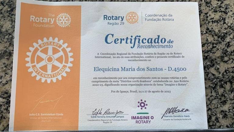 Por ocasião do 46º INSTITUTO ROTARY, em Foz do Iguaçu, a Governadora 2022-23 Elequicina Santos recebeu da Fundação Rotária – Região 29, o Certificado de Reconhecimento pelo cumprimento da meta “DISTRITOS 100% DOADORES”.