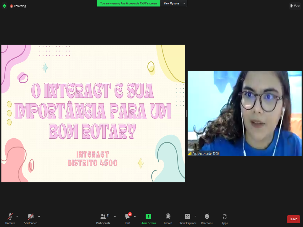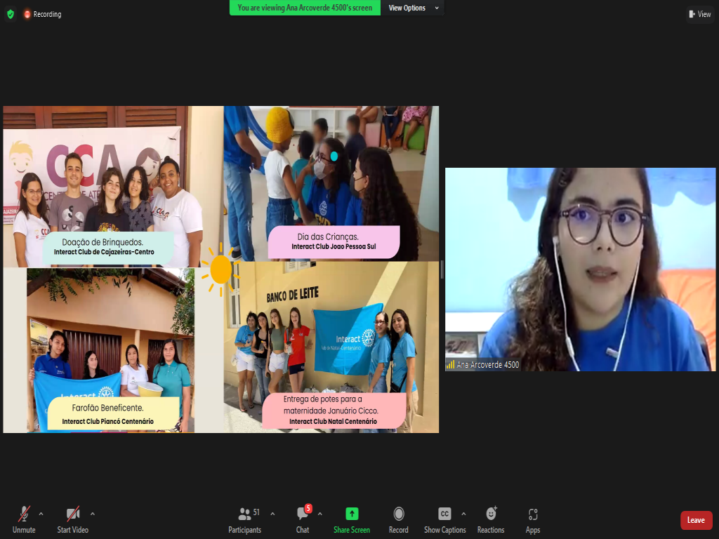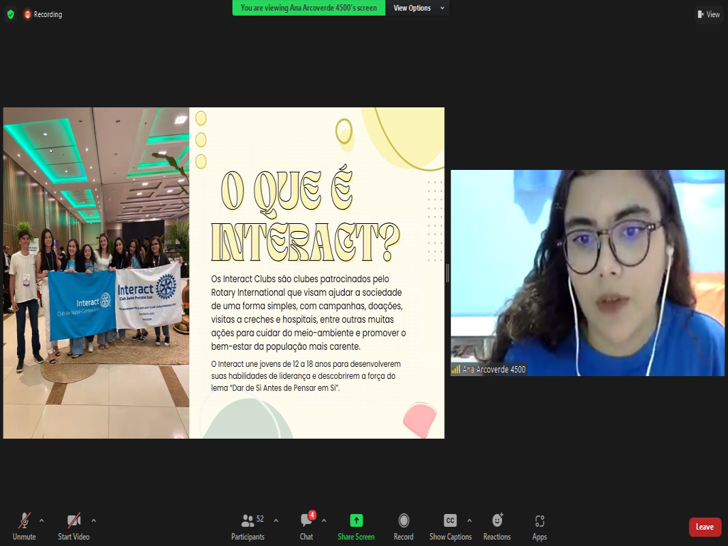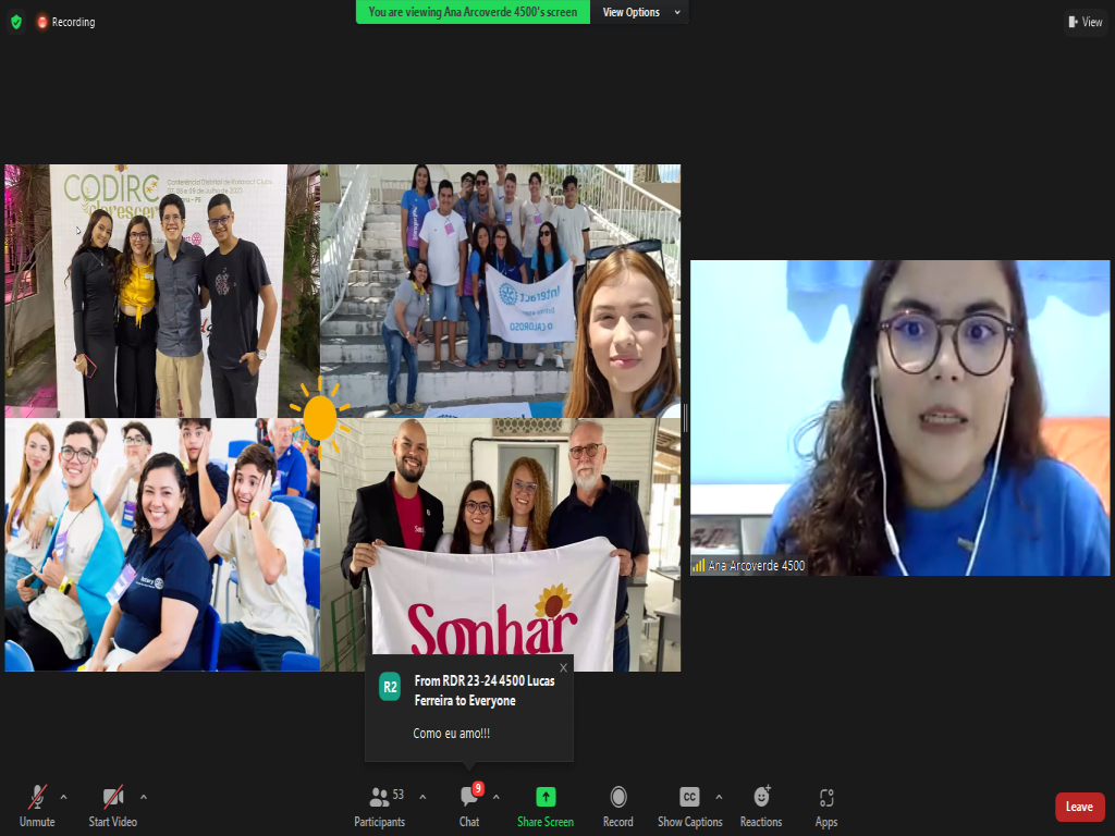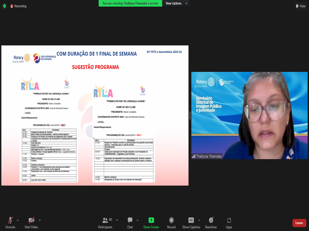 Na parte da Juventude, tivemos Ana Arcoverde, RDI, destacando a importância do Interact para o Rotary. Na sequência, a Presidente do Rotaract Brasil, Bruna Tinti, explanando sobre o Elevate Rotaract. Tivemos ainda a companheira Thalyssa Thannaka, Governadora Assistente da Área 24, apresentando sobre RYLA. O evento foi finalizado com a apresentação da Presidente da Comissão de Intercâmbio, Emanuelle Barreto, falando sobre os programas de intercâmbio com os quais o Distrito atua.