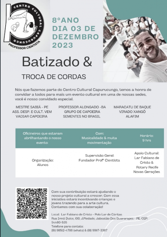 No dia 03 de Dezembro o Rotary Club de Recife Novas Gerações patrocinou o evento de batizado de capoeira para as crianças da creche Lar de Cáritas no Jardim Piedade em Jaboatão dos Guararapes. O evento foi um banho de cultura afro fortalecendo a comunidade e integrando a mesma com a entidade.