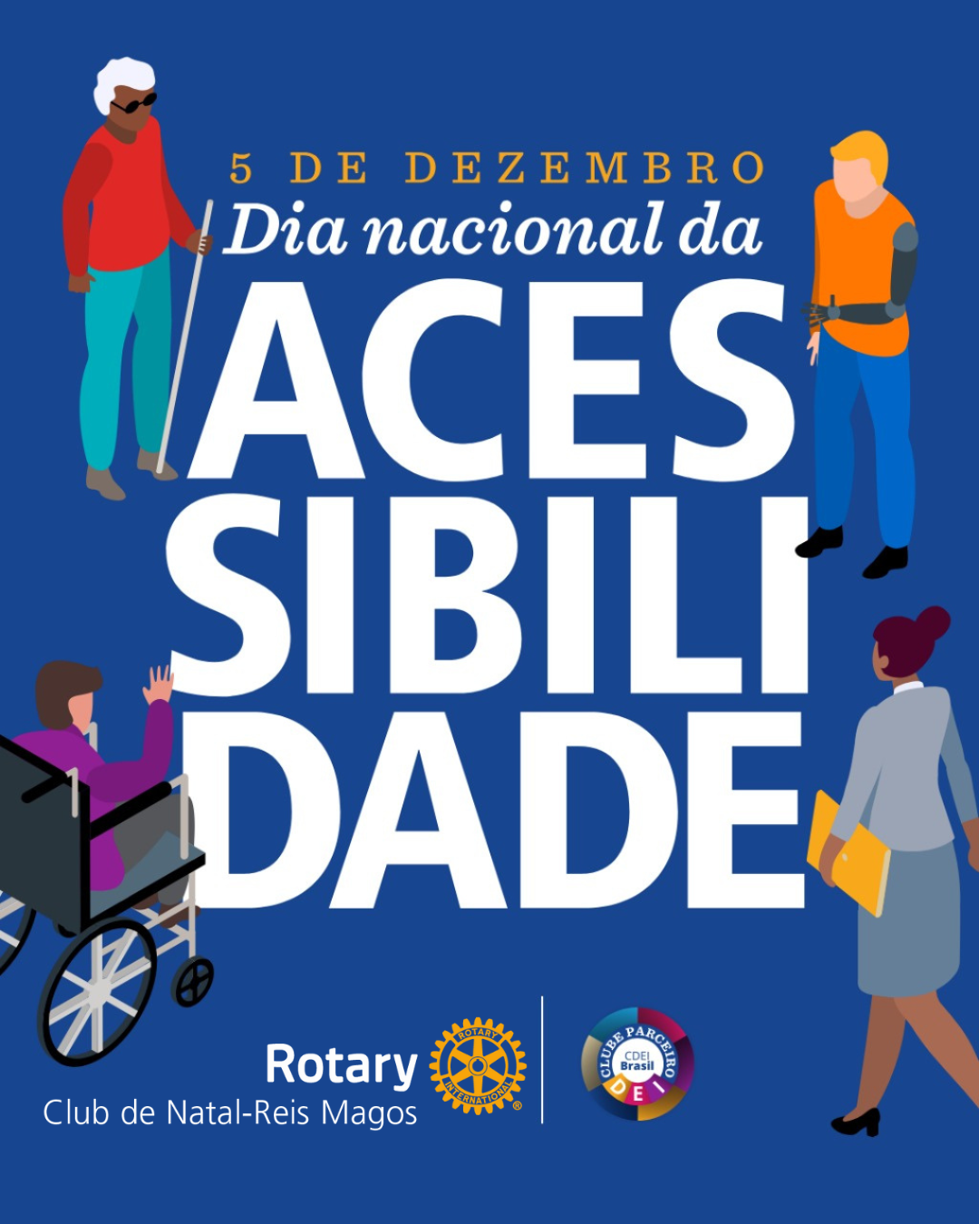#PraTodoMundoVer Texto, centralizado: 5 de Dezembro. Dia Nacional da Acessibilidade. Imagem: fundo azul com quatro pessoas. Uma pessoa preta de cabelos brancos e óculos escuros com uma guia, à esquerda superior. Uma pessoa branca, de cabelos loiros, com braço prostético, à direita superior. Uma pessoa de pele clara, cabelos castanhos, em uma cadeira de rodas, à esquerda inferior. Uma pessoa parda, cabelo avermelhado com um caderno amarelo em mãos, à direita inferior. Todas caminhando em direção ao texto centralizado da palavra "Acessibilidade". Abaixo, o logo deste Rotary e ao lado o selo "Clube Parceiro" do Comitê Diversidade Equidade e Inclusão - Brasil.