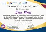 Érica Roriz, casada com Cezar Murilo, mãe de 03 meninos Gustavo (26), Erick (24) e Cezar Murilo (12), associada ao Rotary Club de Engenheiro Paulo de Frontin, Distrito 4571, desde 07/07/2019, defendendo a classificação de Enfermagem com ênfase em Gestão de Projetos.