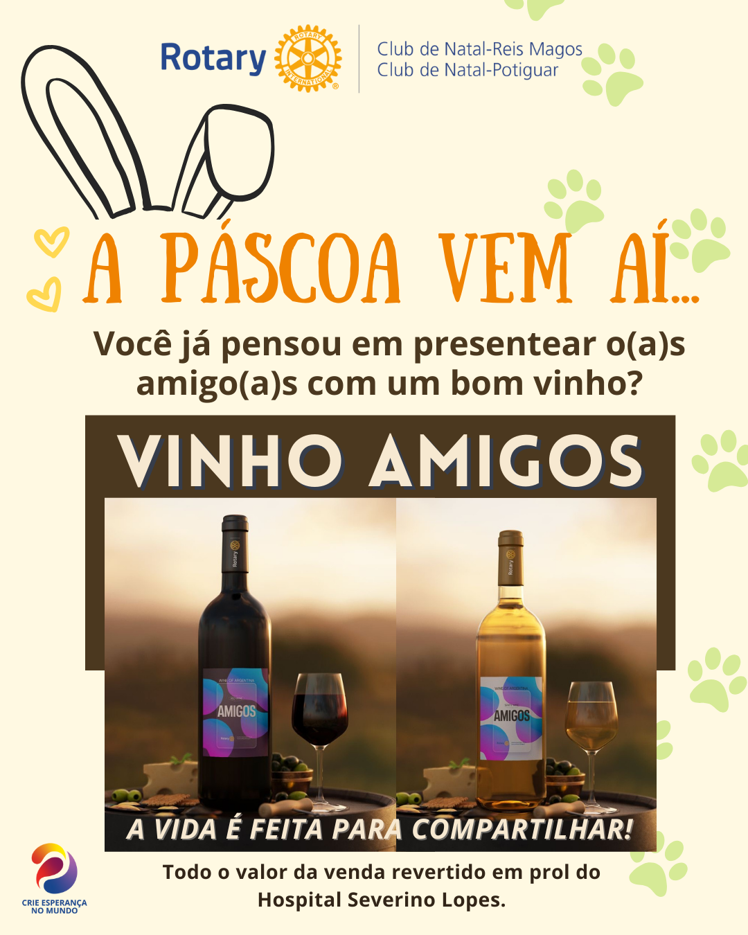 Estamos aqui p/ lembrar que o VINHO AMIGOS é uma excelente opção para acompanhar suas refeições em família e/ou presentear seus amigos. São vinhos originais de Mendoza - Argentina, nas opções tinto e branco. Pelo valor de R$ 50,00 você adquire um vinho em embalagem presenteável. Toda a venda será revertida em prol do Hospital Severino Lopes, também conhecido como Casa de Saúde de Natal.