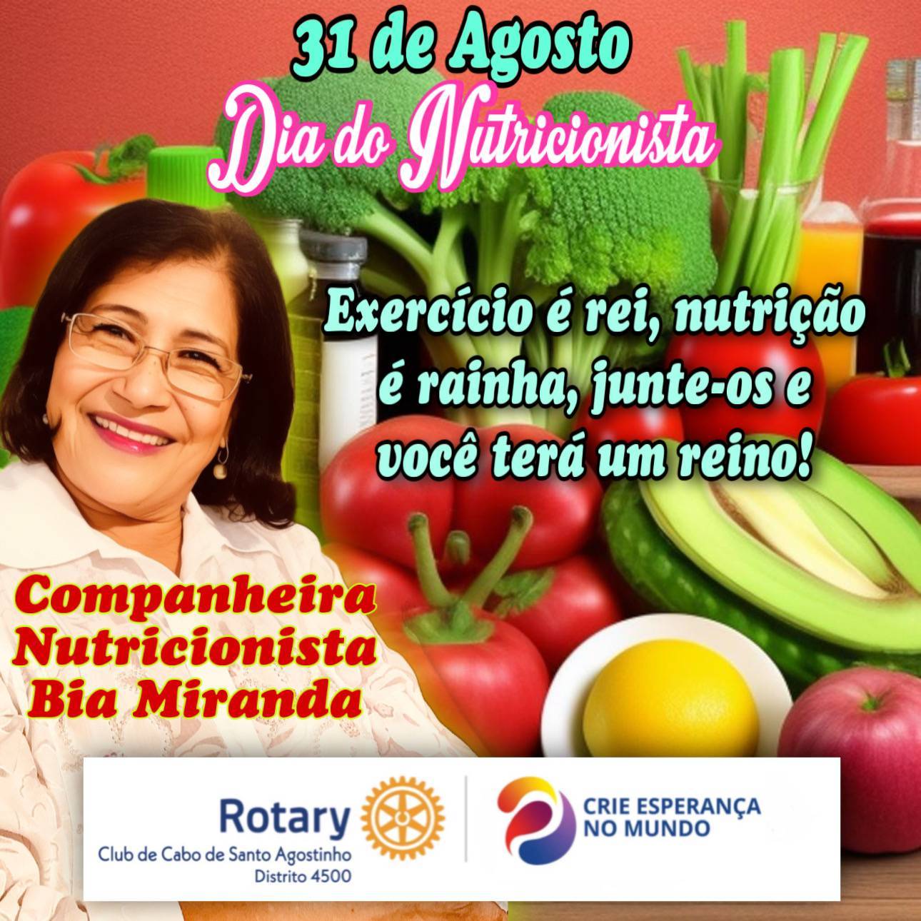 O 31 de Agosto é uma data especial para celebrar e reconhecer o trabalho desses profissionais dedicados à promoção da saúde e qualidade de vida. Neste dia, o Rotary Club Cabo de Santo Agostinho, Distrito 4500, tem a honra de homenagear uma companheira e nutricionista exemplar, Bia Góis Miranda.