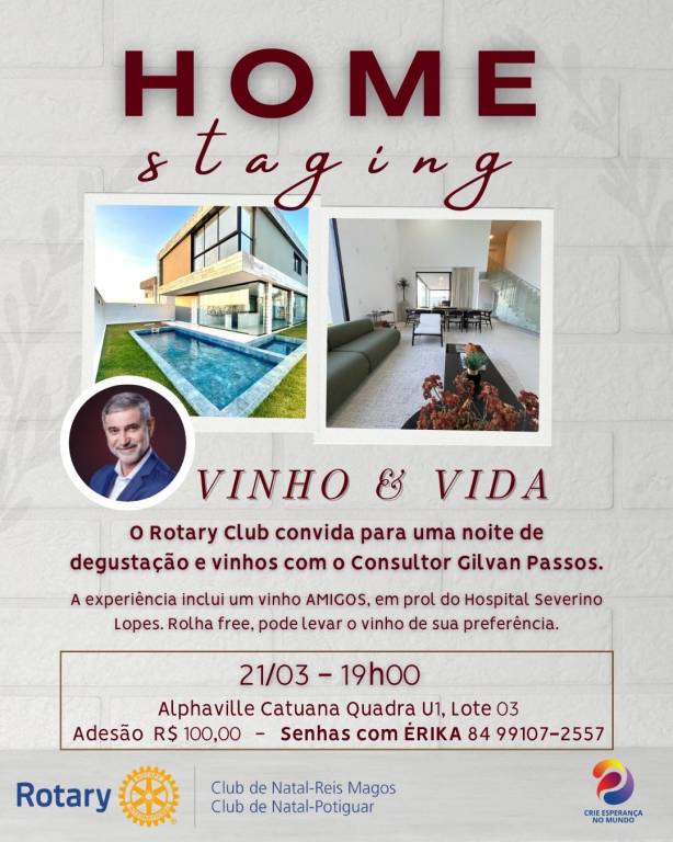 Na noite do dia 21/03 tivemos um evento especial: o Home Staging VINHO & VIDA. A arquiteta e corretora Danielle Véras nos recebeu em uma belíssima casa no Condomínio Alphaville Catuana, a qual está à venda e aberta à visitação, para um evento proposto pelos Rotary Clubs Natal-Potiguar e Natal-Reis Magos.