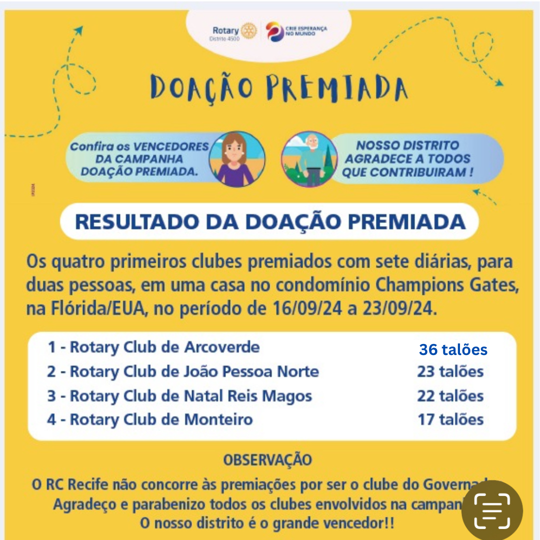 A DOAÇÃO PREMIADA foi idealizada com objetivo de arrecadar fundos para os clubes realizarem suas ações sociais, bem como para contribuir com a Fundação Rotatória, essencial para vinda de recursos para os nossos projetos distritais e globais.