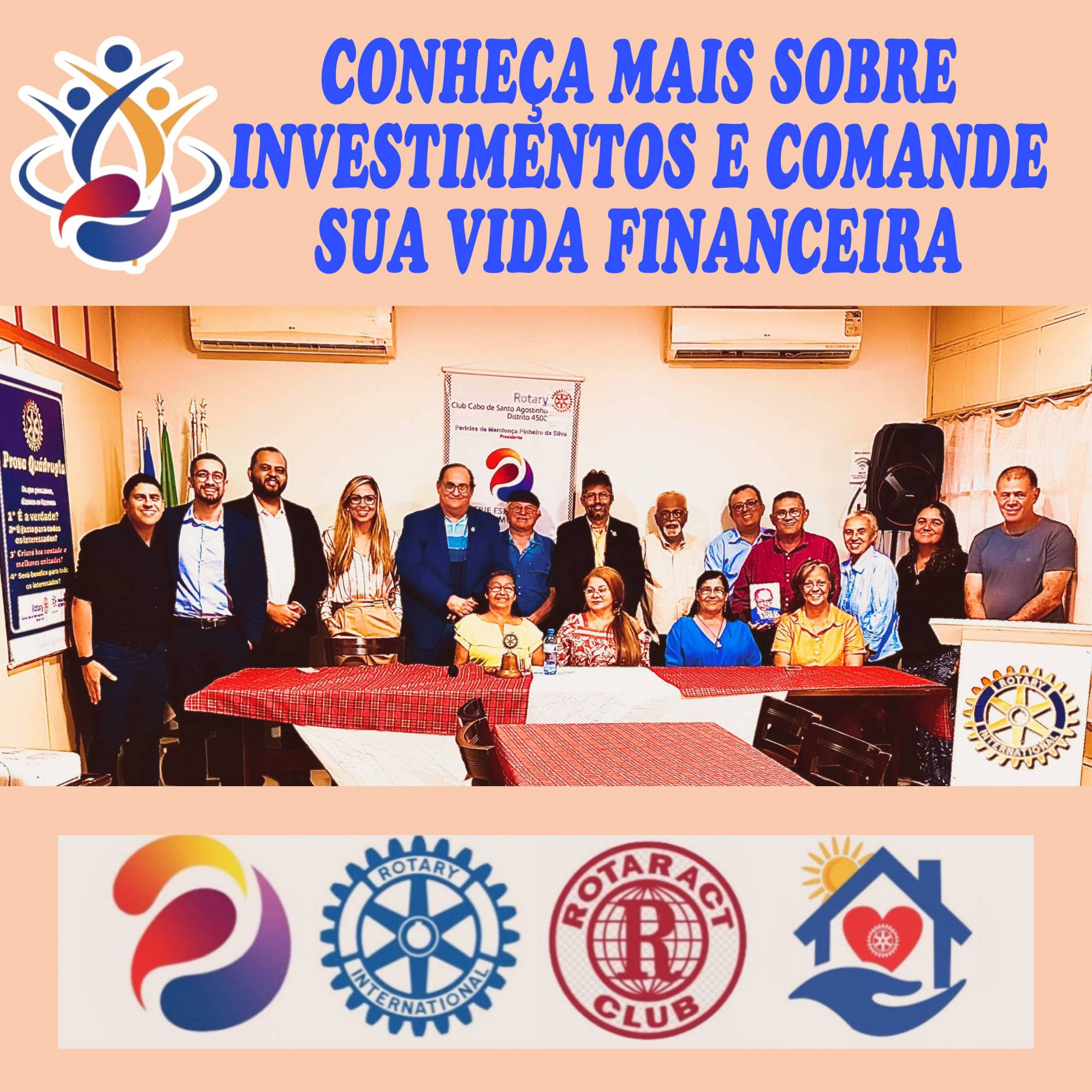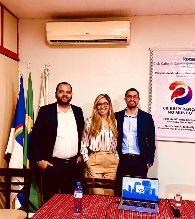 O evento "Conheça Mais sobre Investimentos e Comande Sua Vida Financeira", organizado pelo Rotary Club Cabo de Santo Agostinho, Distrito 4500, foi um verdadeiro sucesso. Realizado no dia 23 de maio, no Restaurante Chácara na VSCM no Cabo de Santo Agostinho, a palestra reuniu profissionais renomados da área de investimentos, como Alexandre Queiroga, Alef Luna e Suyenne Almeida.
