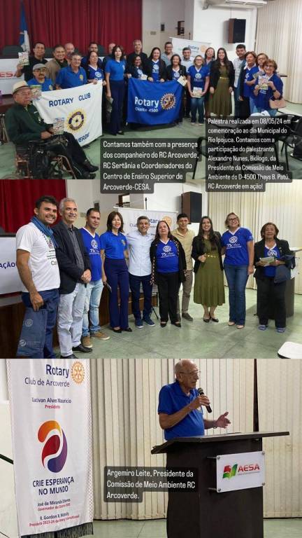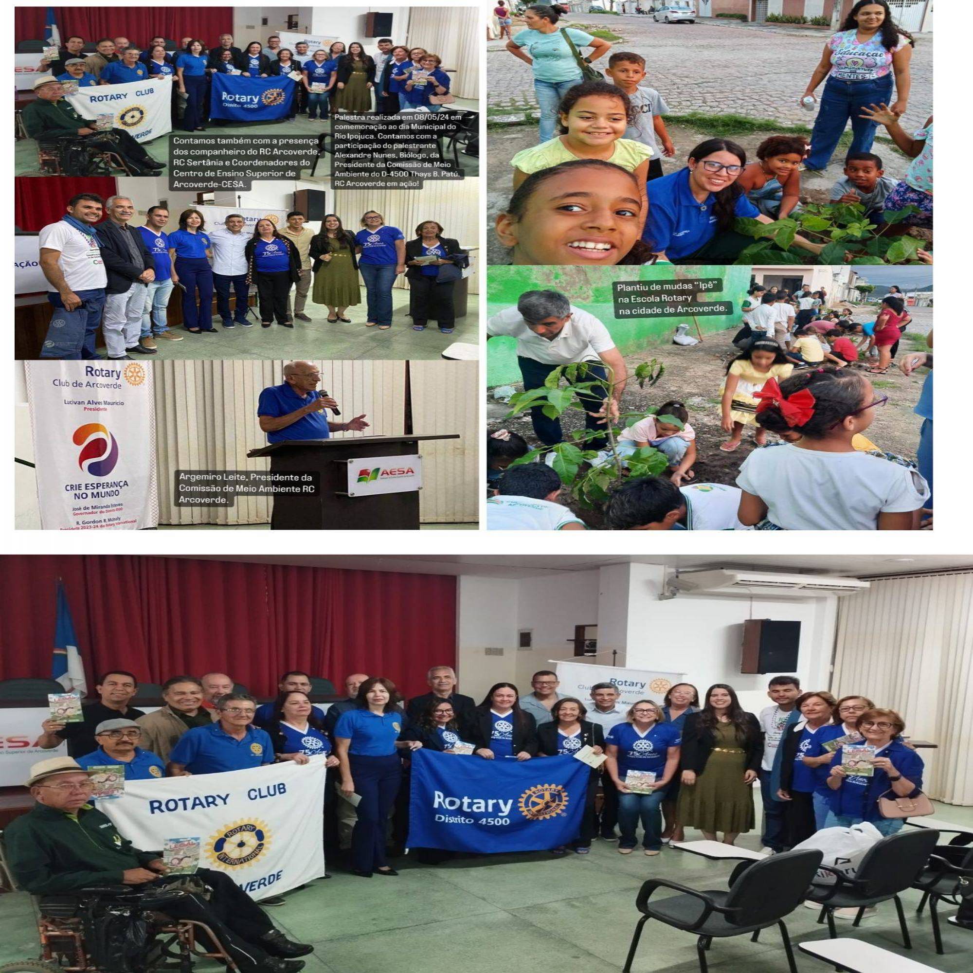 Em homenagem ao dia Municipal do Rio Ipojuca, 09/05, o RC Arcoverde juntamente com o RC Caruaru promoveram, no dia 08/05/2024, INTERCLUBES com as seguintes atividades: Plantio de Mudas - Ipê na Escola Municipal Rotary Alcides Cursino de Siqueira, às 16horas, envolvendo a comunidade escolar, principalmente às crianças, onde os rotarianos Alexandre Nunes, Biólogo, e Thaís Patú, Engenheira Ambiental, falaram sobre a importância da preservação do meio ambiente na teoria e na prática, deixando plantada a semente para um RYLA AMBIENTAL. No auditório da Autarquia de Ensino Superior de Arcoverde – AESA, às 19hs40min, O Companheiro Argemiro Leite, Presidente da Comissão do Meio Ambiente do RC Arcoverde fez a abertura do evento, fazendo sua homenagem ao rio com um poema. Em seguida a Companheira Thaís Patú destacou a importância da Responsabilidade Social do Rotary para com o Meio Ambiente. Dando continuidade, Antony Justus, responsável pela locução anunciou o Palestrante, rotariano Alexandre Nunes que proferiu a Palestra com o tema: IPOJUCA – UM RIO DE CONTRASTES, destacou a importância da informação, conscientização, preservação e recuperação do Rio Ipojuca, o papel que o rio desempenha para região, o abastecimento de água, fauna e flora local, os impactos ambientais e as ações necessárias para sua proteção, ressaltou, ainda que, Cuidar do Rio é uma questão de Saúde Pública. Foram feitos vários questionamentos ao tema proposto, e, logo após, foram sorteadas várias Ecobags, incentivando a prática sustentável. O Movimento Ecológico SOS Rio Ipojuca, já conseguiu adesão, formalmente, do Estado de Pernambuco, e, dos municípios de Caruaru e Arcoverde. O Rio Ipojuca abrange parcialmente territórios de 25 municípios: Arcoverde, Belo Jardim, Bezerros, Caruaru, Chã Grande, Escada, Gravatá, Ipojuca, Pombos, Poção, Primavera, Sanharó, São Caetano, Agrestina, Alagoinha, Altinho, Amaraji, Cachoeirinha, Pesqueira, Riacho das Almas, Sairé, São Bento do Una, Tacaimbó, Venturosa e Vitória de Santo Antão; Companheiros! Os convido a fortalecer O Movimento Ecológico SOS Rio Ipojuca aderindo formalmente esta causa. Contactar com Mônica Miro RC Arcoverde.