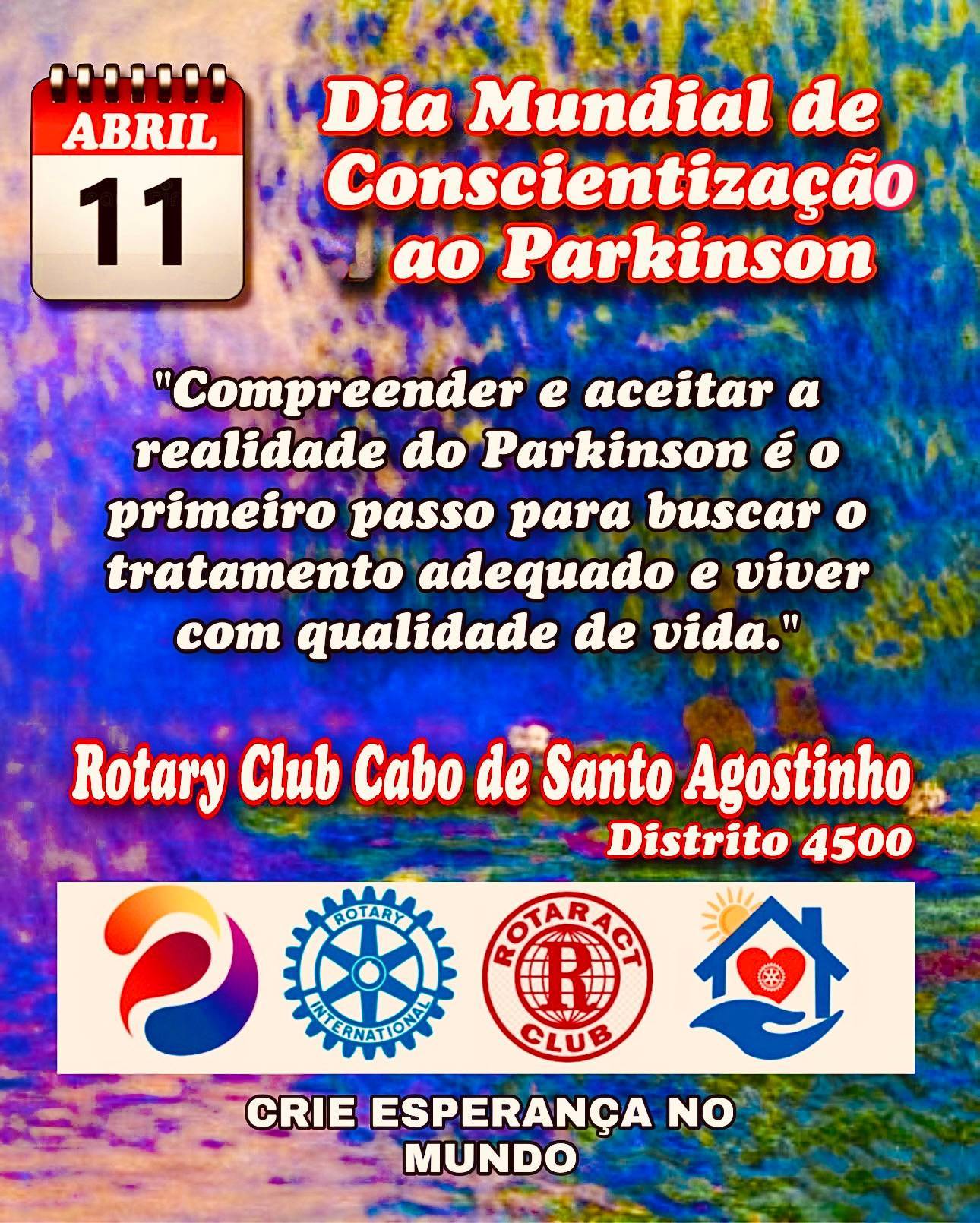 É com grande satisfação que, sob a presidência do empresário Péricles de Mendonça, do Rotary Club Cabo de Santo Agostinho, no biênio 2023/2024, nos unimos em celebração ao “Dia Mundial da Conscientização Sobre Doença de Parkinson”, que se observa no dia 11 de abril. Neste dia, somos chamados a aumentar a conscientização sobre esta condição que afeta milhões de pessoas em todo o mundo.