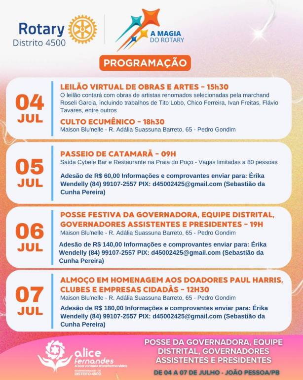 A Governadora 2024-25 Alice Fernandes iniciou sua gestão com uma programação de eventos na cidade de João Pessoa para marcar sua posse, ao longo da semana.