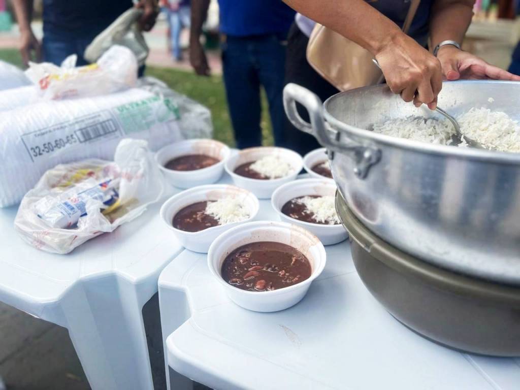 A feijoada acompanhava arroz, farofa e rapadura, e foi vendida ao preço de R$ 10,00 (Dez Reais).